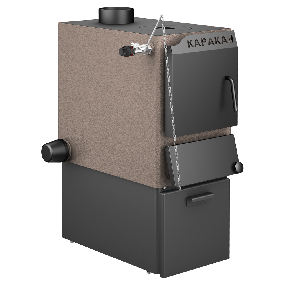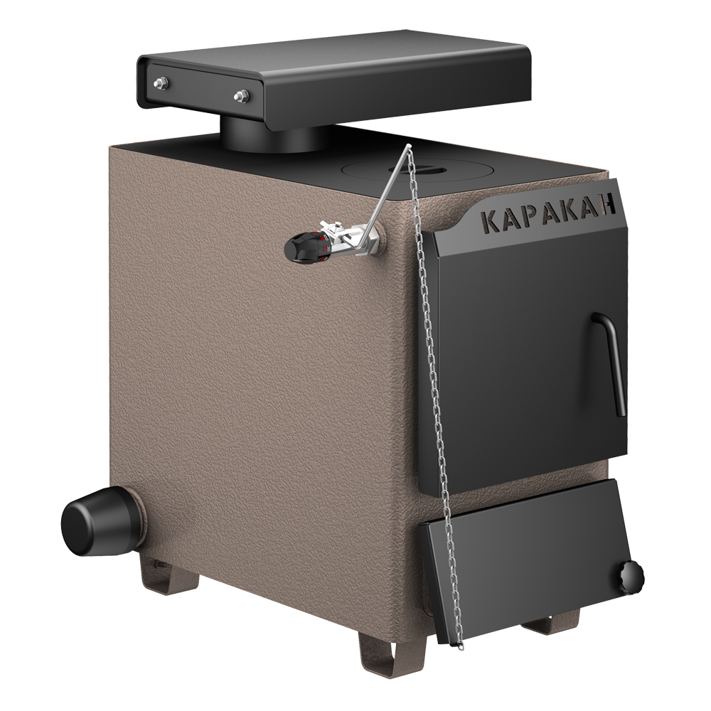 Твердотопливный котел Каракан-8 ТПЭ 3 имеет длинную топку (48,5 см), позволяющую топить как углем, так и дровами. Еще одна изюминка котла - вертикальный дымоход, вмонтированный в варочную панель. Для увеличения высоты котла используется специальная подставка. Её корпус выполнен в едином дизайне и снабжен выкатным ящиком. Подсоединение котла к кирпичной дымовой трубе производится через стальной переходник дымохода 7-11 КВ-ПГ. Этот переходник позволяет вывести дымоход не только назад, но и вбок.