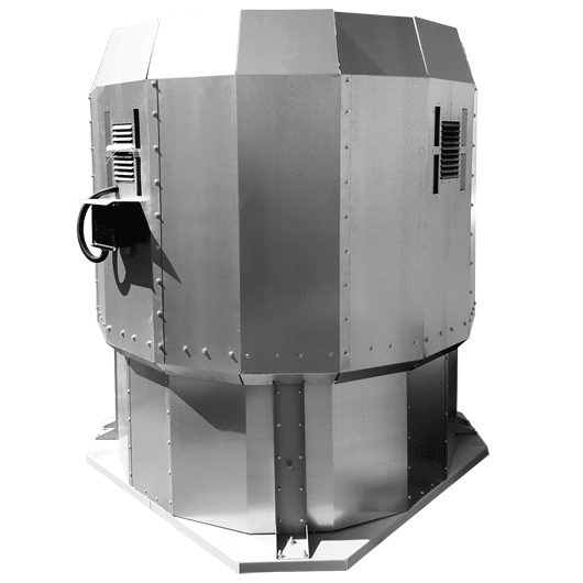 Вентилятор радиальный крышный, одностороннего всасывания, для систем дымоудаления, с выбросом потока вверх.